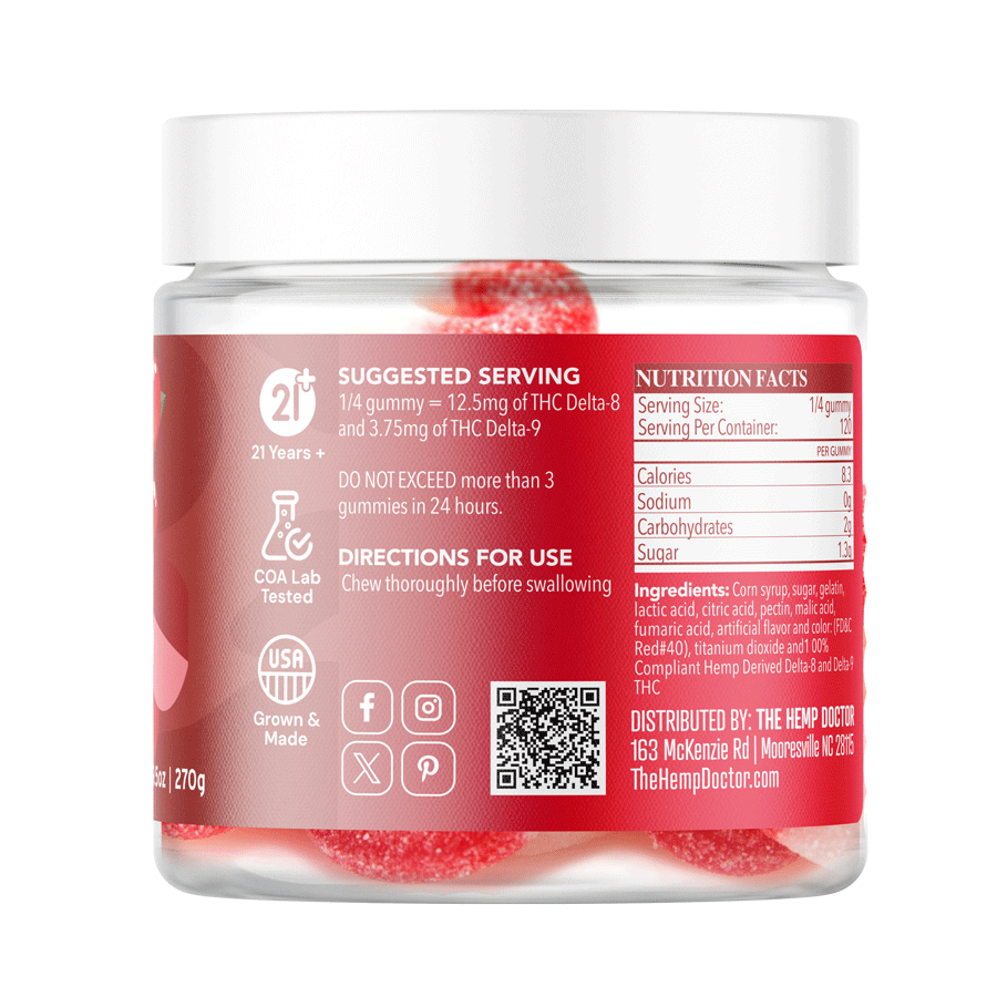 Start with 1/4 gummy (≈12.5mg Δ8 + 3.75mg Δ9) and wait 60–90 minutes before considering more. This helps you find your ideal comfort level safely.
